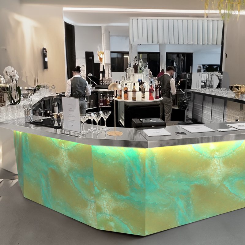 Un bar dal carattere deciso ed originale. I pannelli in metallo opaco satinato lo rendono perfetto per location dal sapore industrial. Un effetto materico ed elegante al tempo stesso.